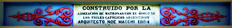 Da cuenta de ello, una importante placa de mármol de carrara ubicada sobre el portal de ingreso principal de la fachada, con el objeto de reflejar de una forma material un acto destacable y merecedor de ser celebrado en el tiempo para todas aquellas personas que visiten el lugar a lo largo del tiempo, claro reconocimiento de victoria ante una labor excepcional emanada de un difícil trabajo, en cuyo ámbito su cincelado, nos reconduce sintéticamente al recuerdo a sus propiciadoras y el origen de los fondos: « Construido por la Asociación de Matronas con el óbolo de los fieles católicos argentinos ....... », y con letras mas destacables, la memoria al autor del proyecto, ejecutor de esta obra y donante principal: « ....... Arquitecto Noé Macchi 1.884 ».